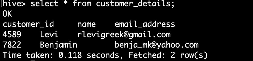 We have a customer_details table in Hive. The table contains the customer id, name and email_address.